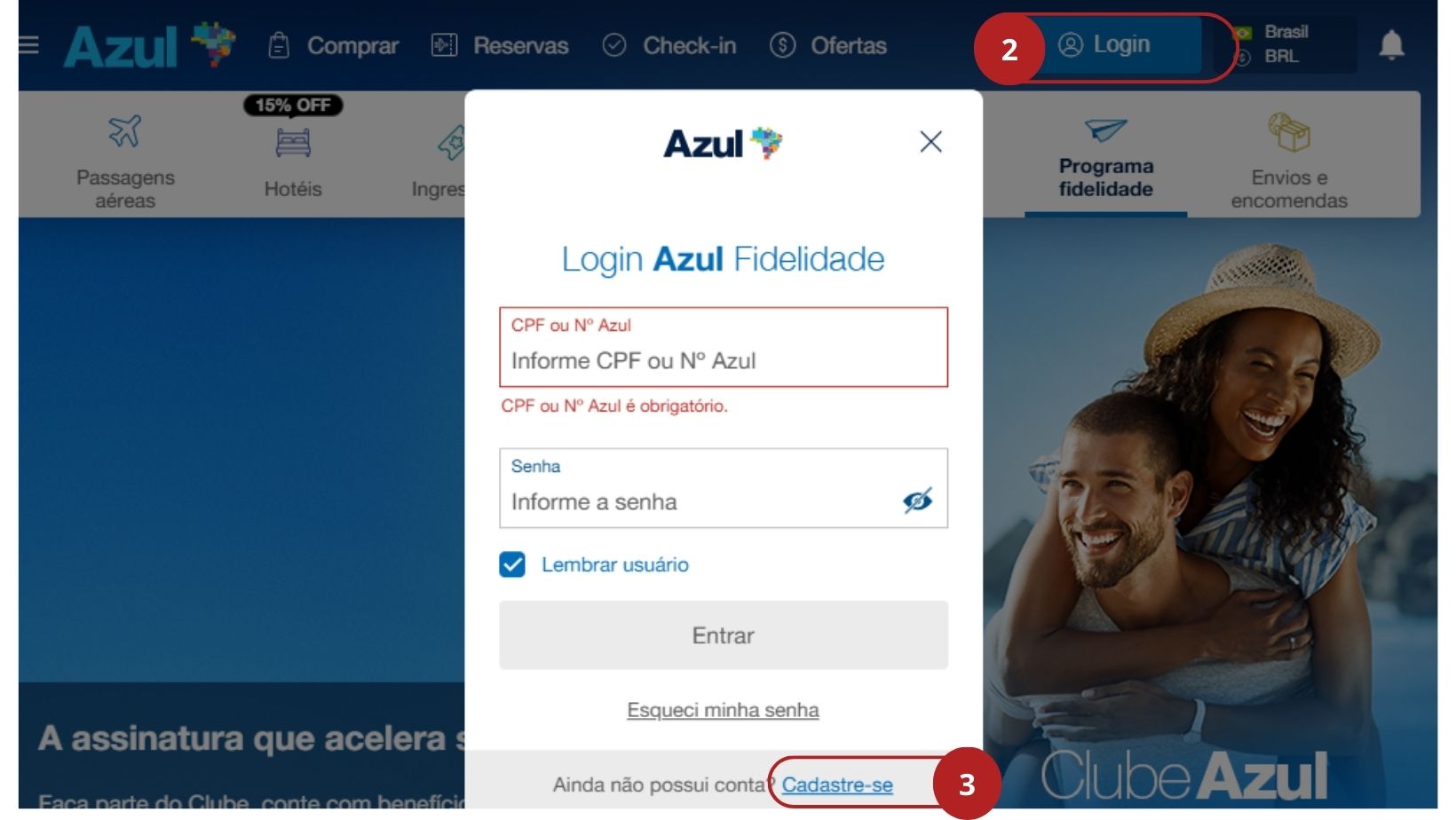 Na nova tela que aparecerá, você precisará informar seu primeiro nome e o CPF ou número de cadastro da sua conta TudoAzul. Certifique-se de usar o correto para evitar contratempos.